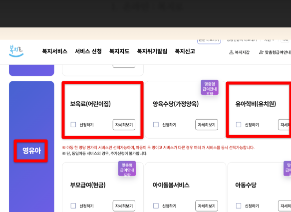 - 복지급여 신청 → 영유아 카테고리 선택