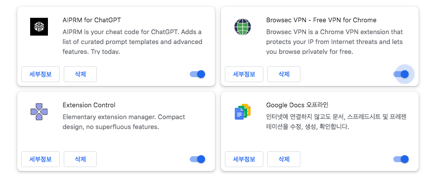 자주 사용하지 않는 확장은 비활성화하고, 필요한 확장은 활성화 상태로 유지하세요. 의심스러운 확장은 제거를 권장합니다.
