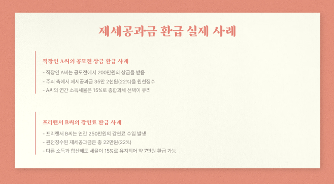 경품에 당첨되거나 상금을 받을 때는 미리 세금을 계산해보고, 필요하다면 종합소득세 신고를 통해 환급받을 수 있는지 확인해보세요.