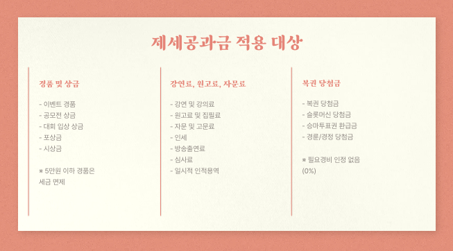 • 필요경비율: 경품/상금 80%, 강연료/원고료 60%, 복권 0%