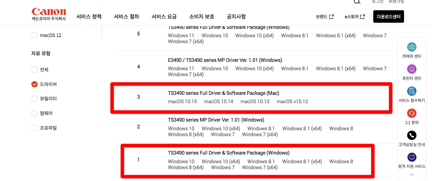 3. 캐논 드라이버 다운로드 시 주의사항