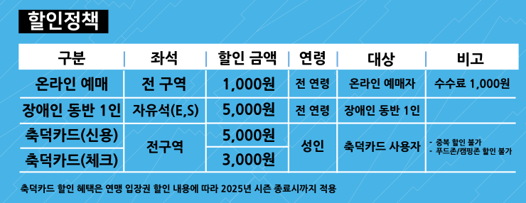 축덕카드 | 자유석(W,E,S) | 최대 5,000원 할인 | 카드 사용자 | 중복 할인 불가 |