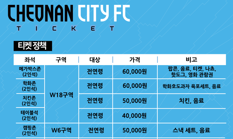 - 천안시티FC 공식 홈페이지 또는 인터파크 티켓, 티켓링크에서 온라인 예매 가능합니다.
